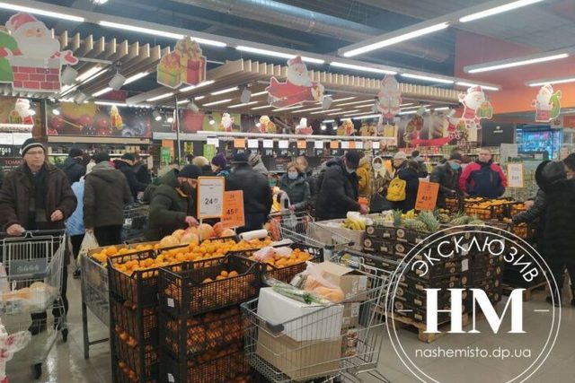 До наступления Нового года осталось несколько часов. В Днепре, кажется, лишь небольшая часть жителей, которая успела заранее закупиться к празднику, сейчас размеренно готовится к праздничному столу. Большинство же горожан штурмуют магазины в поисках всего необходимого.