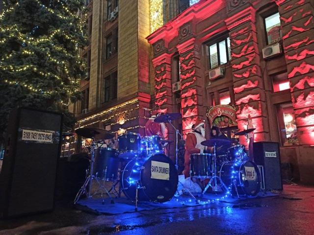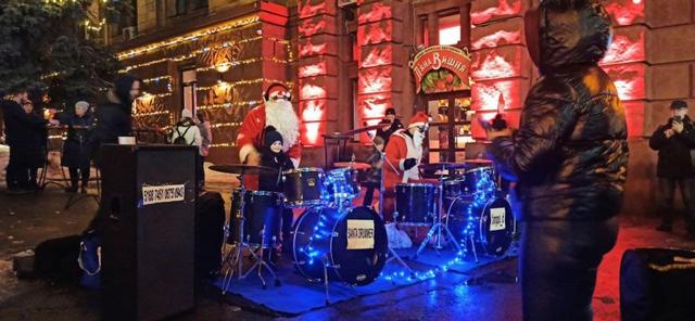 Новогодние мелодии и рок-хиты под аккомпанемент барабанов жители Днепра слушали в исполнении местных музыкантов в костюмах Санта-Клаусов.