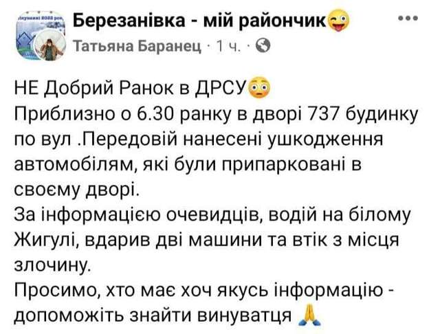 В Facebook-группе "Березанівка - мій райончик" просят откликнуться очевидцев и помочь в поиске виновника ДТП.