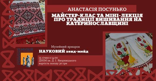 15 января гостей музею ждут лекция и мастер-класс по традициям вышивки на Екатеринославщине (14 часов), а также лекция (15 часов) и изготовление древних трикрас – колтов.