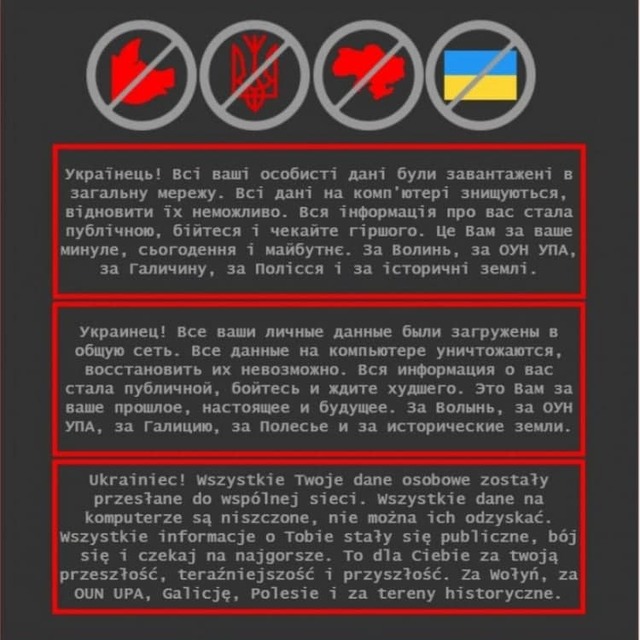 «Украинец. Все ваши личные данные были загружены в общую сеть. Все данные на компьютере уничтожаются, восстановить их невозможно. Вся информация о вас стала публичной, бойтесь и ждите худшего. Это вам за ваше прошлое, настоящее и будущее. За Волынь, за ОУН УПА, за Галицию, за Полесье и за исторические земли», — говорится в тексте.