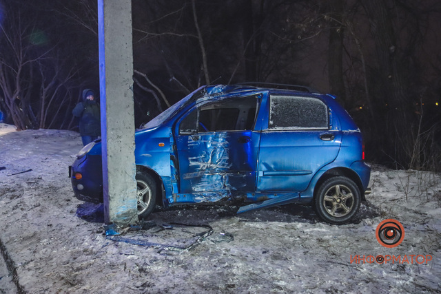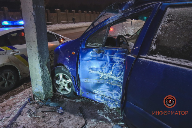 Инцидент произошел примерно в 16:30. По предварительной информации от полиции, в машине ехала супружеская пара. Авто занесло на скользкой дороге и она въехала в столб. У водителя черепно-мозговая травма и порез на голове.