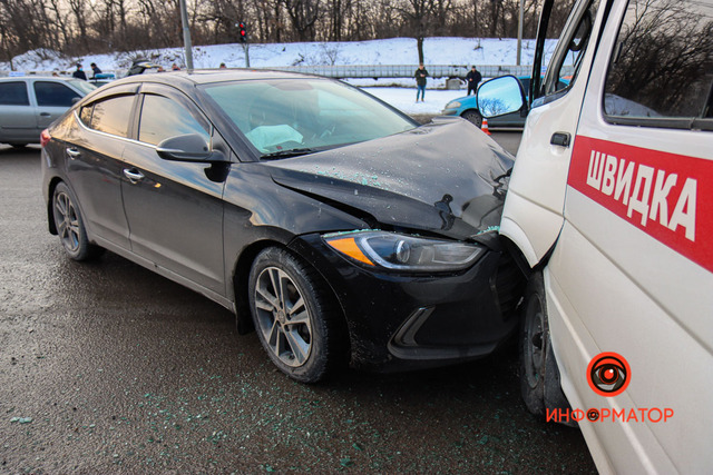 Инцидент произошел около 14:50. По предварительной информации от полиции, водитель Hyundai проехал на «красный» и врезался в Geely. От удара его отнесло в автомобиль скорой, который выезжал с прилегающей территории.