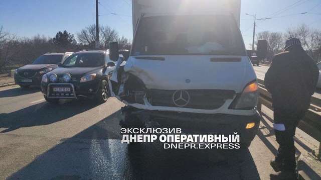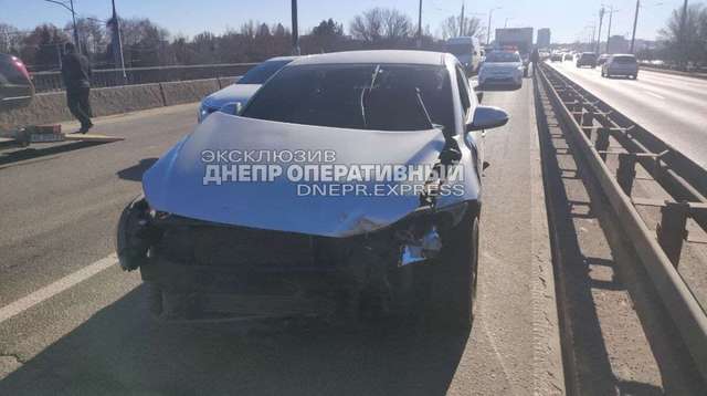 В Днепре на Центральном (Новом) мосту микроавтобус Mercedes-Benz врезался в легковой автомобиль Huundai. В результате аварии водитель легковушки получил травму ноги.