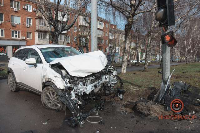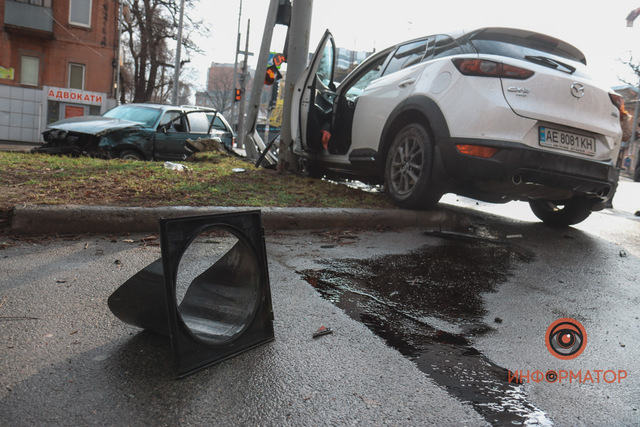 Mazda из-за аварии отлетела в светофор. В ДТП пострадали оба водителя транспортных средств, их забрали скорые.
