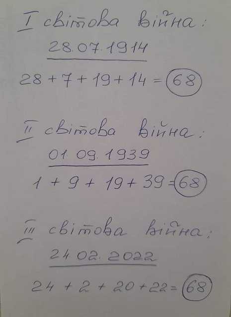 Так считают нумерологии, высчитавшие зловещее полное совпадение нумерологиического сложения дат начала Первой, Второй Мировых войн и даты нападения путиновских орд на наш страну. Во всех трех случаях получается одна и та же цифра.