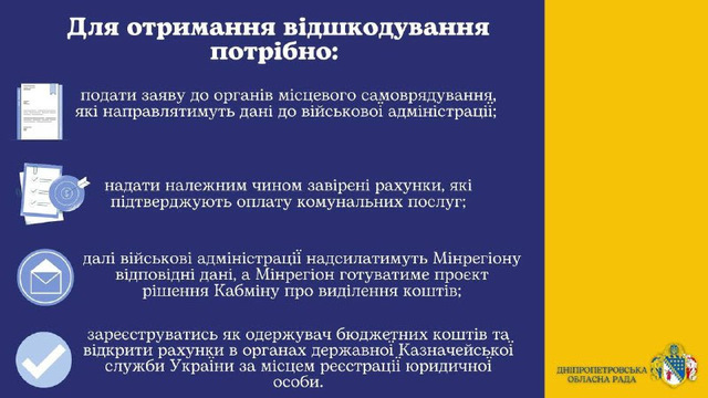 «По состоянию на сегодняшний день в регионе находятся более 17 тысяч переселенцев. Все они снабжены всем необходимым. Очень важно, что в это непростое время государство заботится о людях и помогает им», - сказал глава Днепропетровского областного совета и заместитель руководителя совета обороны области Николай Лукашук.Возмещаться будут расходы на коммунальные услуги, предоставленные с 1 марта 2022 года и только после оплаты коммунальных услуг за предыдущий период. То есть в начале апреля громады смогут подавать свои заявки на возмещение.
