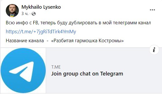 Ранее Михаил Лысенко заявил на своей странице в Facebook-странице, что он завел телеграм-канал «Разбитая гармошка Костромы».