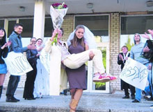 «Никак, свадьба едет... Хотя сегодня ж день разводов», — удивилась продавец Мария, торгующая овощами недалеко от здания Ленинского РАГСа. Тем временем загадочный кортеж стремительно пронесся мимо. Весело развевались на ветру необычные украшения авто — туалетная бумага и... резиновые изделия народного потребления №1. А за первым авто, подскакивая на каждом ухабе и вываливаясь в пыли, волочилась подушка-сердечко. Наконец удивительная кавалькада остановилась и из машин стали выходить не менее удивительные персонажи.