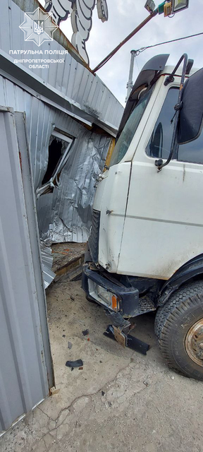 Столкнулись грузовой автомобиль МАЗ с автомобилем Opel. В результате столкновения грузовик продолжил неуправляемое движение и въехал в здание шиномонтажа рядом. К счастью, обошлось без пострадавших.