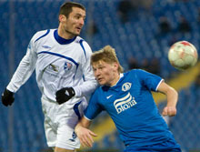 А уже через минуту "Днепр" повел в счете. Мощнейший удар из угла штрафной Деонас отбил перед собой, но с "выстрелом" метров с 10-ти Калиниченко уже ничего поделать не мог. Этот гол не лучшим образом повлиял на действия хозяев. Днепряне до перерыва уверенно контролировали ход игры. За пять минут до свистка на отдых Руслан Ротань выиграл борьбу в середине поля и отдал мяч на ход Селезневу. Увы, Евгений уже находясь в штрафной, замешкался и оказался под углом к воротам, после чего назревавший было голевой момент так и не состоялся.