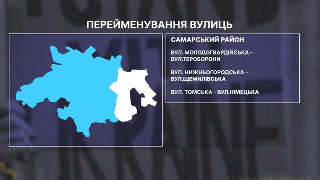 «В городе в общей сложности более 300 топонимов, требующих дерусификации и деколонизации. На каждой сессии мы переименовываем по частям. И будем продолжать это делать», – прокомментировал Борис Филатов.Ул. 1 Мая (Шевченковский р-н) теперь носит имя украинского архитектора Владимира Заболотного, который был одним из авторов проекта здания Верховной Рады Украины и разрабатывал планы застройки ряда городов Днепропетровщины.