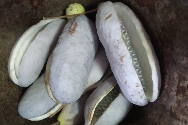 «В ботанічному саду ДНУ рідкісне у нас плодоношення надзвичайно цікавої рослини - Akebia quinata.Ось зібраний урожай.