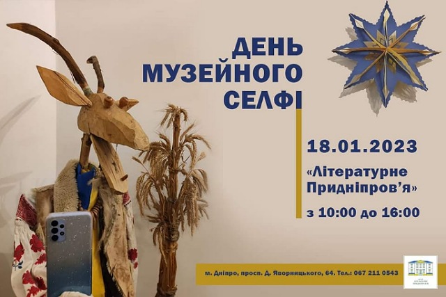 «18 січня 2023 року у музеї «Літературне Придніпров’я» усі бажаючі могли долучитися до відзначення Museum Selfie Day - Дня музейного селфі!У кожного була унікальна можливість зробити світлини на тлі інсталяції «Сходи до Перемоги» чи дивовижних витинанок Ольги Іващенко; також чекала на парне селфі наша файна кізонька у літерному вертепі!».