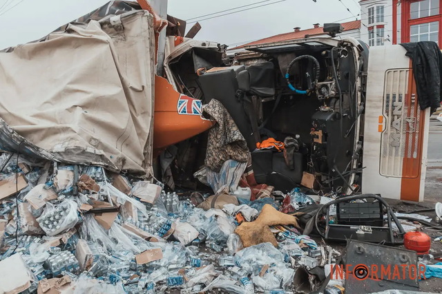 По предварительной информации, водитель двигался со стороны проспекта Ивана Мазепы в сторону проспекта Сергея Нигояна. При повороте у грузовика отказали тормоза, он перевернулся и влетел в электроопору.