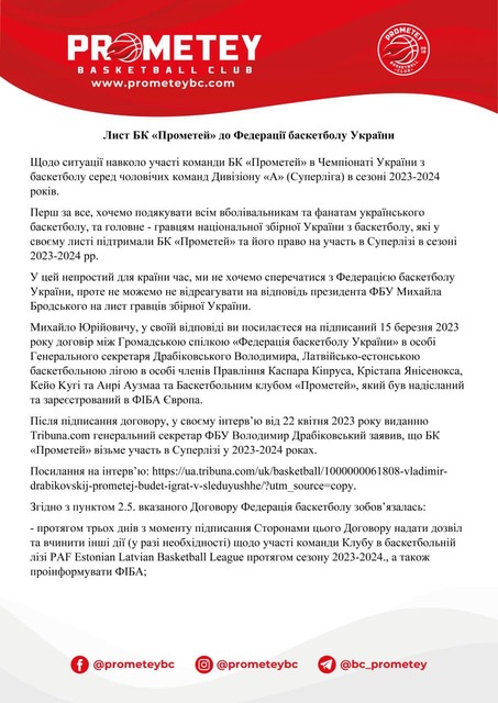 «БК «Прометей» не планує заявлятися до Вищої ліги.Про це йдеться у відкритому листі клубу до Федерації баскетболу України. У ньому «Прометей» висловлює свою позицію щодо ситуації навколо участі команди БК «Прометей» в Чемпіонаті України з баскетболу серед чоловічих команд Дивізіону «А» (Суперліга) в сезоні 2023-2024 років».