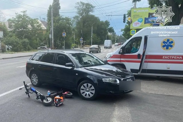 В среду, 28 июня, в Днепре произошло ДТП на улице Калиновой. Там столкнулись мужчина на электросамокате и Audi. Пострадавшего с места аварии забрала скорая.