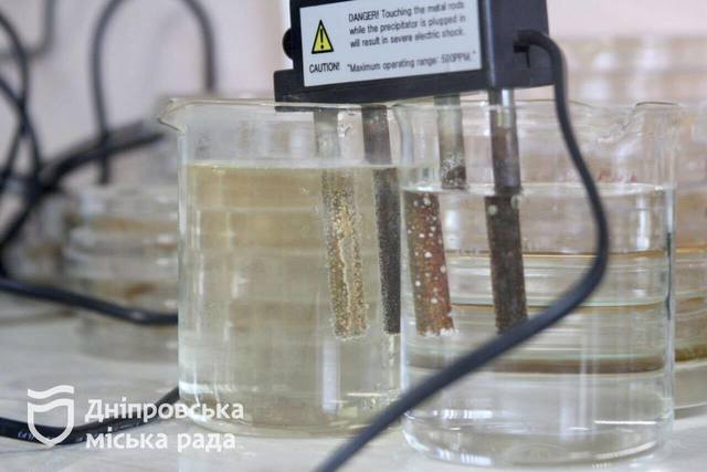 «В этой лаборатории проводим биоэкологические опыты. С помощью современного оптического микроскопа и других портативных цифровых приборов измеряем параметры качества воды и получаем результаты экспресс-методом. По разным реакциям определяем содержание растворимого кислорода в воде, солей и других компонентов, таких как жесткость, нитраты, хлориды, фосфаты и тому подобное», – отметил заведующий учебной лабораторией кафедры экологии «Днепровской политехники» Вячеслав Федотов.Результаты исследования проб воды из реки Днепр: основные химические и органолептические показатели соответствуют нормам для коммунально-бытового водопользования. Минерализация невысокая – 220-230 мг/л; уровень pH – 7,2; мутность – 8,7 единиц. Общая жесткость – 10,2 ммоль/л. Нитраты по NO3 – 45 мг/л. Все упомянутые показатели пока в пределах нормы.