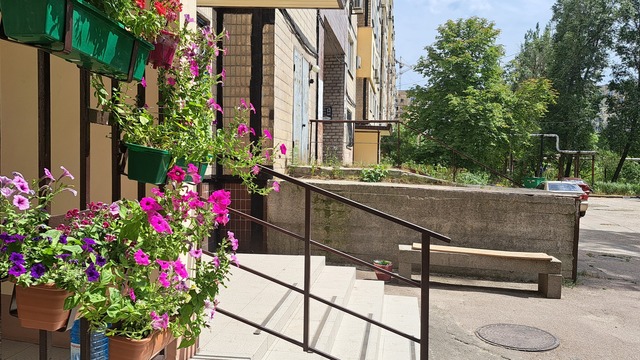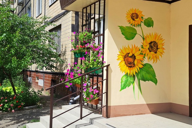 Уцелевший, соседний с разбитым, подъезд этого дома украсили удивительные цветочные композиций. Как живые цветы, высаженные возле подъезда, так и красивый мурал у входа в подъезд.