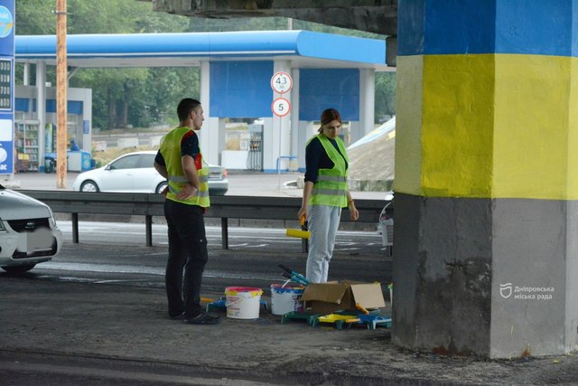 «Мы закупили все материалы и собственными силами обновили мурал. Хочу отметить, что работы проводила молодежь, это не профессионалы, им было очень сложно, это требовало определенной физической подготовки. С нами находился профессиональный инструктор, полиция, чтобы заботиться о безопасности».В акции приняли участие около 100 представителей Молодежного совета Днепра, треть из них - лица с временно оккупированных территорий - поделилась директор департамента молодежной политики и национально-патриотического воспитания горсовета Дарья Била: «Флаг и герб - это символы, которые в том числе наши воины берут с собой в бой. Для меня они лично очень ценны, ведь несут в себе знаки, силу и волю, которую закладывали наши предки. Они вдохновляют наше настоящее и будущие поколения. Поэтому мы не можем говорить, что это акция одного дня, ведь все, кто будут здесь проезжать, проходить - будут видеть эти символы, и это определенное напоминание всем, что мы украинцы и нам есть за что бороться».