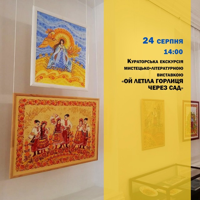 14:00 Кураторська екскурсія мистецько-літературною виставкою «Ой летіла горлиця через сад», де представлено петриківський розпис Вікторії Тимошенко, проілюстрований придніпровським фольклором.