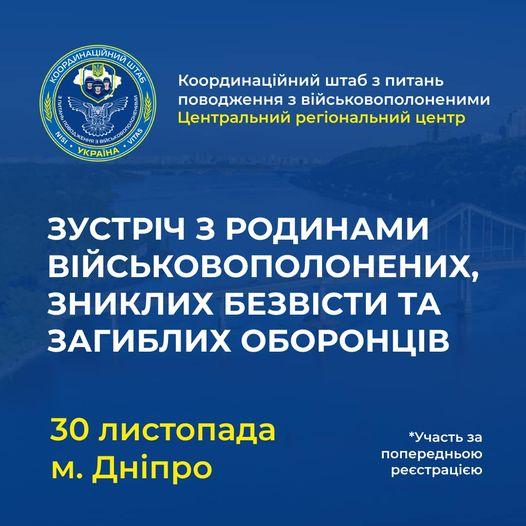 30 листопада Центральний регіональний центр Координаційний штаб з питань поводження з військовополоненими проведе виїзну зустріч з родинами у м. Дніпро.