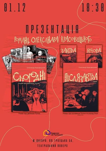 Новий роман Олександра Красовицького "Сьогодні" присвячений максимально актуальній темі- двійникам Путіна. Автор не просто впевнений, що вони існують, він описує все, що цьому передує - пластичні операції, навчання, інструктаж цих людей. Проблеми, пов'язані з ситуаціями, коли їх бачать зблизька приближені до Путіна люди.