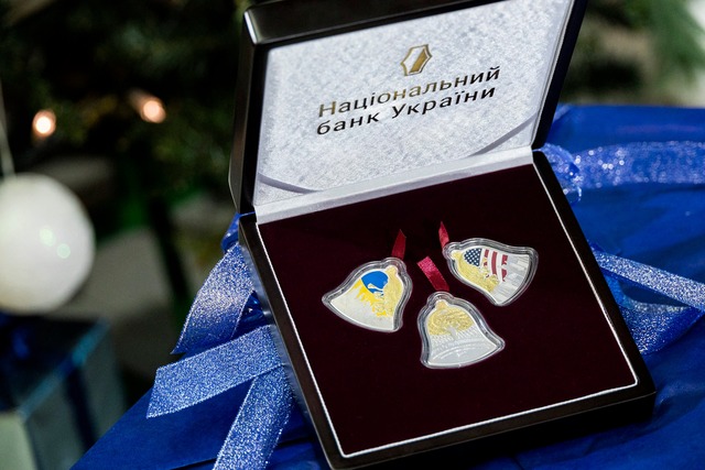 Голова НБУ Андрій Пишний спільно з заступником Голови Місії США в Україні Робертом Нідемом презентували набір із трьох срібних пам’ятних монет “Щедрик – колядка дзвонів”.