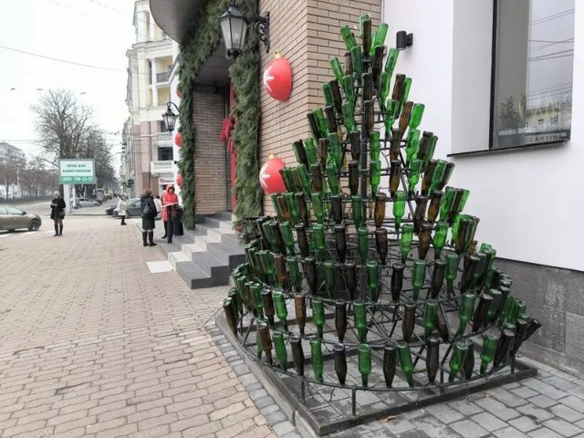 Проспект Дмитрия Яворницкого в Днепре украсила елка из пивных бутылок.