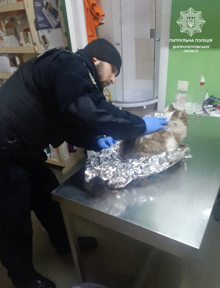 Поліцейські забрали пухнастика до ветеринарної клініки, де лікарі надали йому першу медичну допомогу. У котика зламана щелепа.