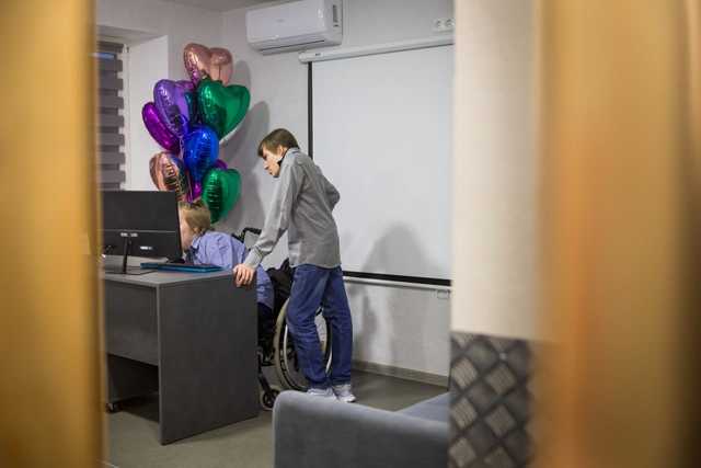 18-річний Тарас вже випробував простір на зручність. Для нього це крута подія, бо захоплюється озвучкою японських мультфільмів. Опановує й програмування. Раніше під рукою був тільки старенький ноутбук. Тепер – повноцінне робоче місце. Інклюзивне. Що важливо для хлопця, бо з клавіатурою він порається підборіддям.
