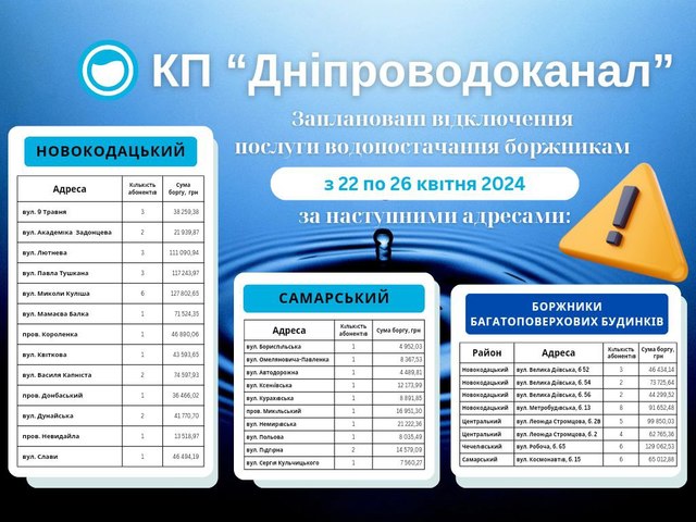 КП "Дніпроводоканал" продовжує обмеження послуги водопостачання боржникам.