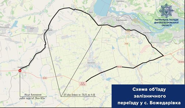 Внимание! 27 и 28 апреля в связи с ремонтом железнодорожного переезда в районе села Божедаровка Каменского района вводится временное ограничение движения транспорта по дороге М-30.