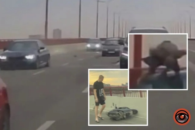 Водитель двухколесного "сделал сальто" в полете, приземлился на крышу авто, а когда водитель BMW тормозил - слетел через капот на дорогу. В воздухе с мужчины даже слетел шлем.