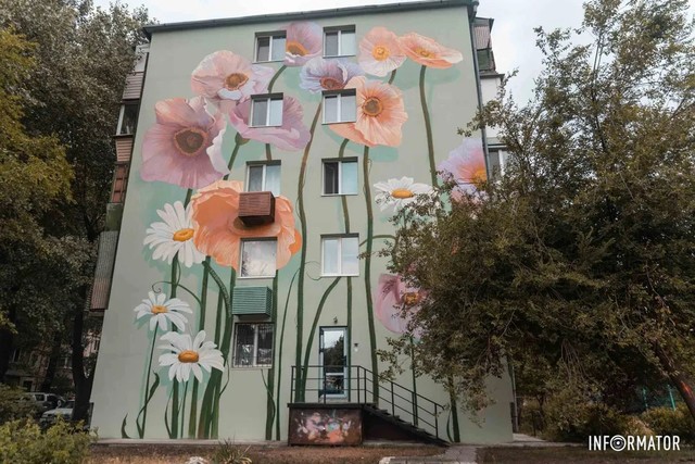 Стоит отметить, что это уже второй цветочный мурал, нарисованный на домах в районе сквера Усачева. Первый появился в июне 2023 в Днепре на фасаде 5-этажки.