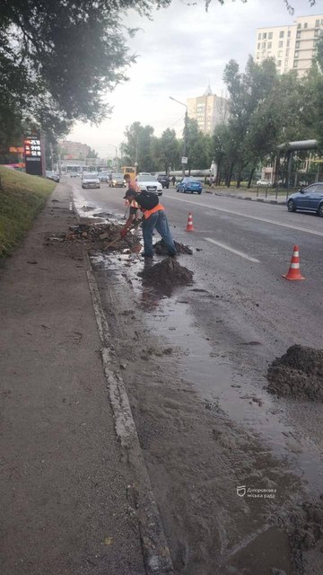 Бригади КП «УРЕА» чергували по місту. Багато дощоприймачів були буквально заліплені листям, гілками, сміттям. Через це утворились локальні тимчасові калюжі, які зійшли відразу після припинення дощу. Бригади працювали по місту і прибирали сміття з дощоприймачів, аби вода швидше сходила.