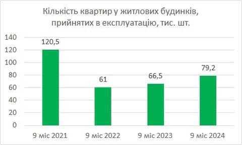 «Обсяги уведеного в експлуатацію житла продовжують зростати, утім відновлення є нерівномірним за регіонами та типом житла.За даними Державної служби статистики, за 9 місяців 2024 року було прийнято в експлуатацію 6,73 млн. квадратних метрів житла (+23,5% проти відповідного періоду минулого року), кількість зданих квартир в одно і багатоквартирних будинках становила 79,2 тис. штук (+19,1% проти 9 місяців 2023 року)».
