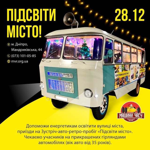 Автопробег 28-го декабря «Подсвети город!» обещает стать особенно ярким. Его организует Технический музей Днепра «Машины времени». И главное требование к участникам – украсить свои машины гирляндами и другой подсветкой. В дни раннего наступления сумерек и регулярных отключений света это будет особенно актуально.
