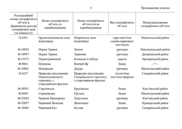 Кабінет міністрів України перейменував понад 200 географічних обʼєктів, назви яких містили символіку російської імперської політики. 34 з них розташовані на території Дніпропетровської області.