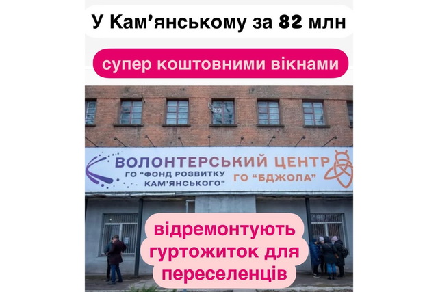 «Мерія Кам’янського, що порівняно недалеко від лінії фронту, вирішила зробити благе діло для людей - відремонтувати гуртожиток для переселенців за 82 млн грн. Там багато людей втікло з окупованої Донеччини, тож діло благе.Але якось вже традиційно для Кам’янського у кожному благому ділі там є місце для адської маржі. Наприклад: вікна вписали по ціні від 17 тисяч гривень за квадратний метр, що вдвічі дорожче найдорожчих вікон такого штибу. Гіпсокартон на чверть дорожче ринку, плити OSB – на третину. Переплати на 4 млн грн вистачило б на 29 мавіків для військових.