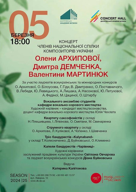 Заключний день фестивалю (05 березня 2025 року о 18.00), постане сучасним калейдоскопом музичних контрастів епохи модернізму, означеної радикальністю змін мистецьких традицій минулих часів, у сторону набуття спрощеності музичного вислову, його функціональності, загальної лаконічності і невибагливості, абсолютної спрямованості на щонайбільше відкриття новаторських рішень творчого процесу. Такого роду інтенції сучасної музичної творчості будуть представлені мистецтвом трьох, найбільш творчо активних у сьогоденні, дніпровських композиторів, зокрема Олени Архипової, Дмитра Демченка та Валентини Мартинюк – членів національної спілки композиторів України».