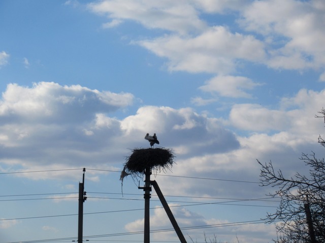 «До нас прилетіли лелеки. Ура! В селищі Веселі Терни давно було гніздо лелек. Я важала, що багато років там ніхто не жів.Але ні - лелекі вже тут. Нарешті я їх сфотографувала! Хай їм щастить!».