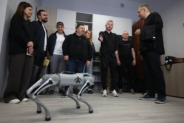 Несподівана зустріч: військовослужбовці 13-ї Бригади НГУ Хартія Сергій Жадан, Євген Турчинов і робопес Елвіс, а також Тимофій Хом'як з 128 Бригади ТРО Дике Поле завітали до Університету митної справи та фінансів.