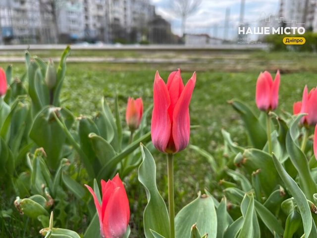 На проспекте Мира в Днепре, вдоль трамвайной линии, распустились первые весенние тюльпаны. Ярко-красные цветы и несколько желтых акцентов стали ярким дополнением городского пейзажа. Эти цветы высажены вдоль проспекта, на зеленых участках между трамвайными путями, которые пересекают одну из крупнейших улиц города.