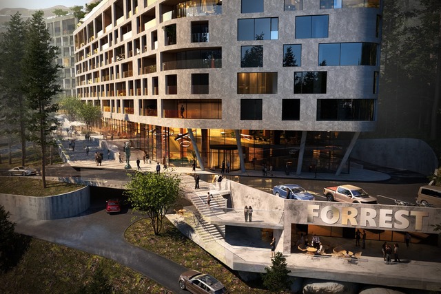«Фрагменти концепції розміщення готельного комплексу FORREST, розташованого у безпосередній близькості до центру гірськолижного курорту Буковелі. Ділянка оточена лісовими масивами без щільного сусідства, тож тут поєднується затишок, зв'язок із природою із активностями неподалік від комплексу.Ділянка знаходиться на схилі пагорба із гарними краєвидами. Головною ідеєю є створення променадної «Набережної», із різними зонами активного відпочинку на ній. А також трьома хаотично розгорнутими відокремленими різновисокими об'ємами для кращих видових розкриттів.