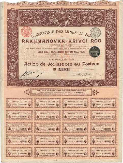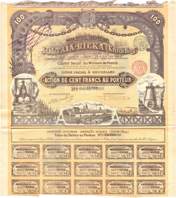 Також у Парижі в друкарні «Сhaix» художники Марі Навельє (Navellier Marie) і Є. Чейлер (E. Chayllery) виконали ескізи для акцій бельгійського АТ Залізних рудників «Рахманівка – Кривий Ріг». Невідомий дизайнер французької кампанії Паперових грошей, що в Парижі, створив дизайн з багатьма малюнками виробничих процесів на акції бельгійського Гірничопромислового АТ «Жовта річка. Кривий Ріг», Брюссель, 1900 р.