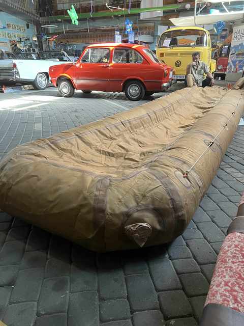 «Колекція нашого музею доповнилась рідкісним експонатом. Це – надувний евакуаційний трап для порятунку пасажирів з літаків. Експонат вельми масштабний, тому його довелось розташувати на кузові та кабіні мікроавтобусу «Фольксваген».
