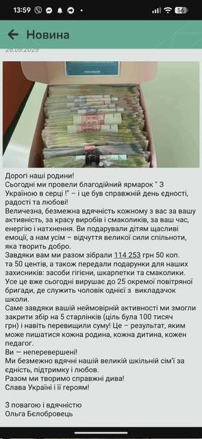 «За один день благодійної ярмарки, яка була проведена в київській школі m.Primary ОСОКОРКИ, зібрано 114 тисяч грн. на Старлінки для 25-тої бригади 7 корпусу ДШВ.