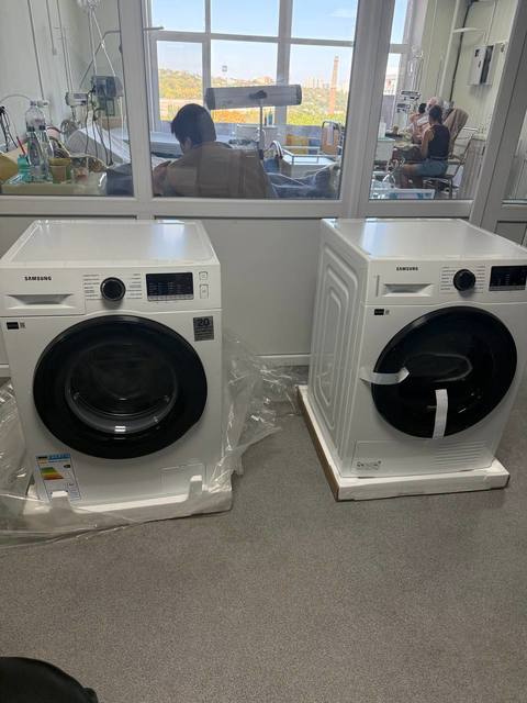Друга нагальна потреба була у пральній та сушильній машині. У кожного з Вас зараз є змогу без зайвих наших пояснень зрозуміти: як заживає шкіра після опіку, адже постійно виділяється рідина з ран... Пелюшки звісно використовують... але ж постіль на ліжках потрібно міняти постійно. Санітарки були змушені усе прати вручну. просто уявіть. Тому дуже терміново в рамках допомоги від Асоціації ми закупили цю надважливу техніку.