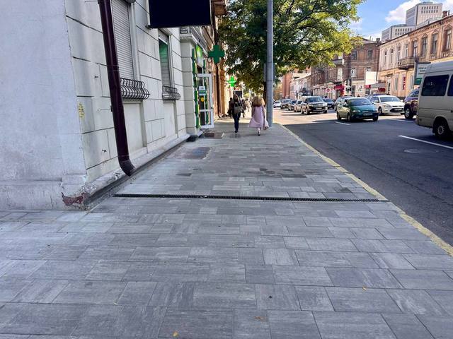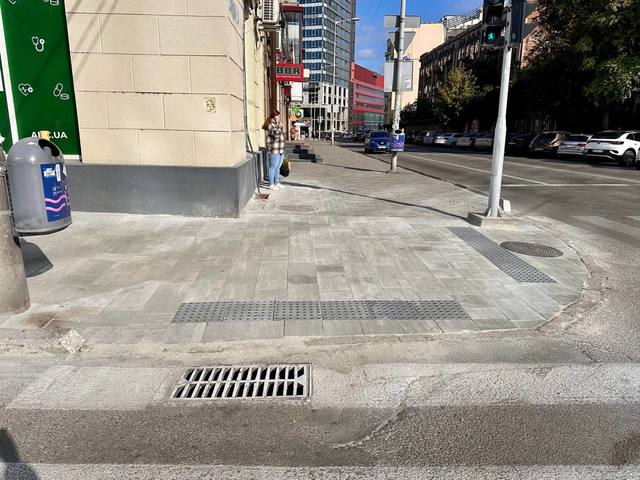 "Главное, что использовали стандартный формат плитки без фаски и тактильную плитку цвета «графит». Причем это они сами приняли такое решение, не обращались за советами или помощью.Также под каждую трубу дождевой канализации провели лотки с решетками. К сожалению, в условиях Днепра они быстро забьются листьями и грязью, потому что балансодержатели их не обслуживают.